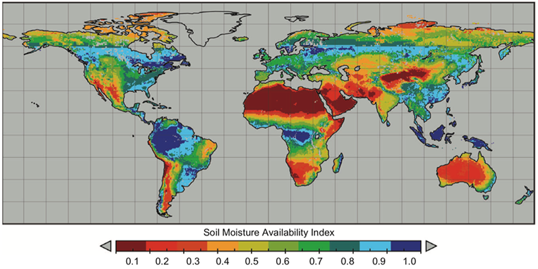 The soil moisture index mapped here is the ratio of estimated actual (water limited) evapotranspiration to the estimated potential (not water limited) evapotranspiration averaged over the year for ca. 2010 land use. Note that more soil moisture is available in the tropics and in temperate areas in North America, Europe, and East Asia. Agricultural areas with lower soil moisture availability include India, and parts of southern Africa, Patagonia, and the southwestern US.