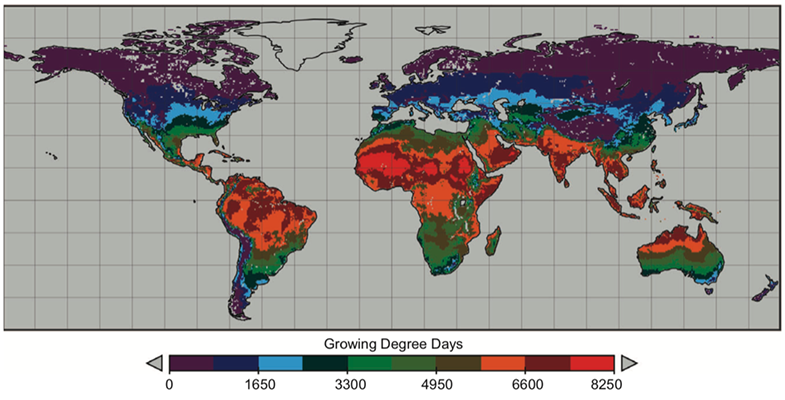 The Growing Degree Day (GDD) value is the integral over time of daily temperatures above the baseline value. Different crops have different baseline temperatures and minimum GDD requirements. The baseline temperatures used in this map are described in Licker (2010). Growing seasons are generally longer and warmer where GDD is higher.