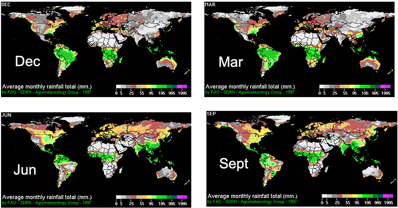 Figure S8.3 Multi-year average monthly total global precipitation for Dec, March, June, and September.