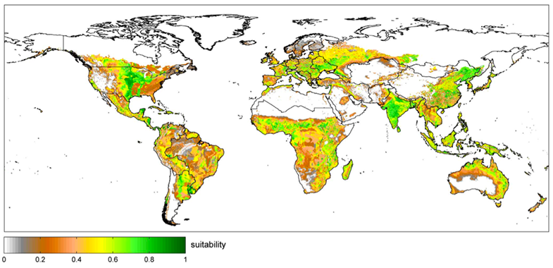 Figure S8.7 Global crop suitability map. Source: Zabel et al. (2014) (see Class 4)
