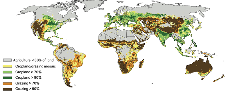 This map superimposes estimated predominantly cropland (green) and grazing land (brown) area fractions with cropland/grazing mosaic (yellow), ca 2000. The concentration of cropland in the northern hemisphere is apparent.