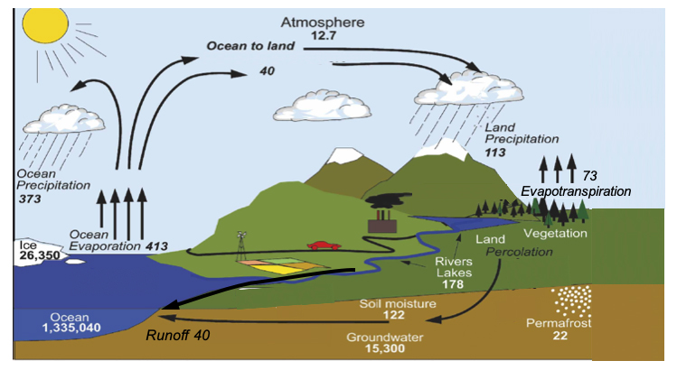 Hydrologists tend to quantify the water cycle in terms of liquid or vapor water fluxes between various compartments that are defined according to application. The above global water cycle diagram includes the following compartments (with water storage noted in 103 km3):