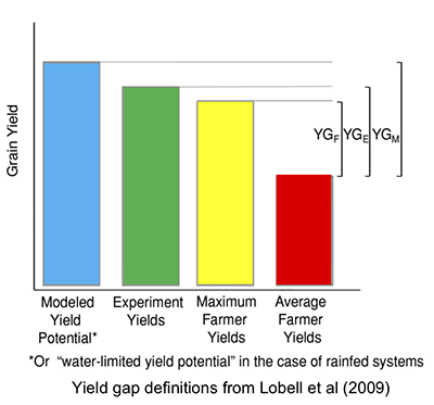 Both of our Class 5 readings focus on cereal yields because of the important role of cereals in supplying food energy. The paper by Lobell et al. (2009) defines different types of yield gaps that rely on different methods for estimating yield potentials. The accompanying figure summarizes these definitions. The ideal site-specific yield potential is an upper limit on yield that is achieved when the crop is not subject to stress from controllable factors, such as nutrient limitations. Uncontrollable site-specific factors that affect yield potential include solar radiation, temperature, and water availability (for rainfed systems). The potential value can be inferred from crop growth models, field experiments, or observed maximum farmer yields. The authors suggest that, although it may be possible to increase yield potential, that will require fundamental changes in plant function that go beyond improvements in management practices. Examples include the high yield cereals bred during the twentieth century “Green Revolution” discussed in Class 11.