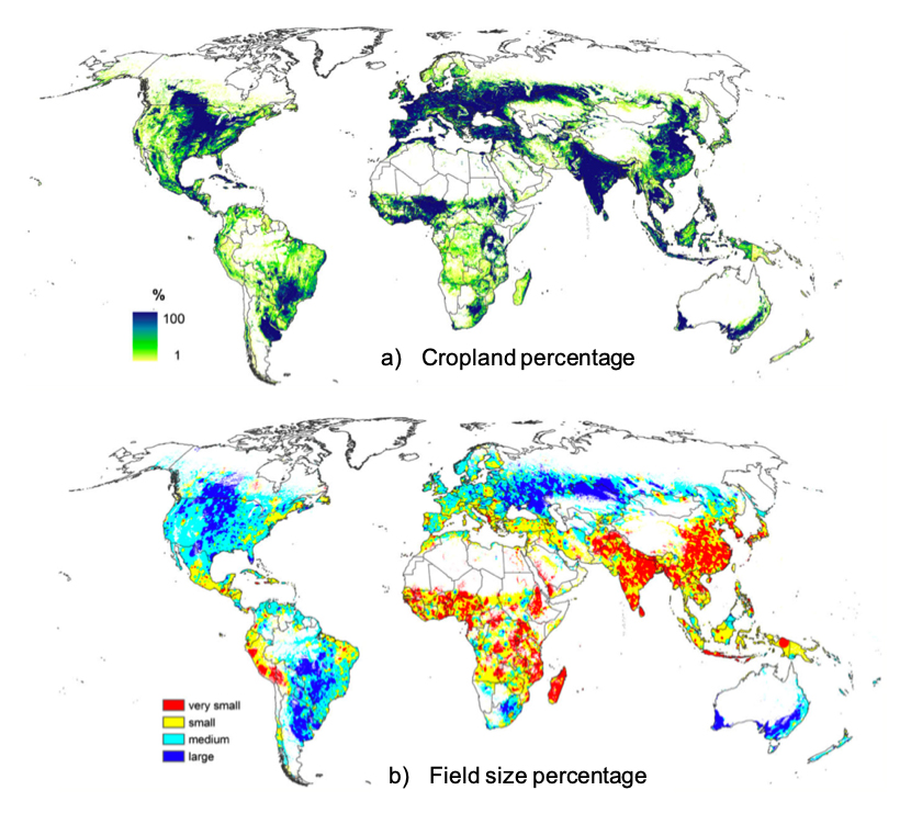 The darker shaded 1 km pixels on the cropland percentage map indicate more densely cultivated regions. The four colors on the field size map show the characteristic crop field size (from “very small” to “large”) identified with a given pixel. The dark green areas in a) are the major food producing regions. The dark blue (large field size) areas in b) generally coincide with the major food exporting areas (North America, Australia, and parts of South America). The red (very small field size) areas in b) indicate regions where smallholder farms dominate (China, India, and sub-Saharan Africa).